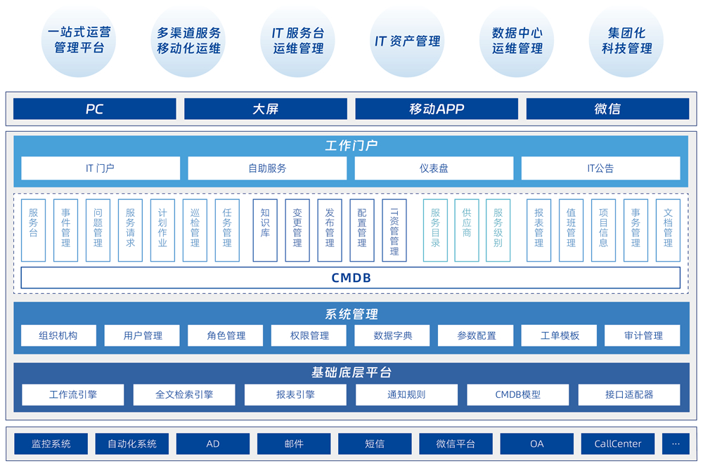 提供一站式 IT 服务管理咨询及解决方案,为 IT 服务数字化运营管理赋能。整个系统基于 ITIL 最佳实践和 ISO20000、ITSS 等标准的 IT 管理的「ERP」,致力于帮助金融、政府、大中型企业等行业客户快速实现自助服务台、事件管理、IT 资产管理、SLA 管理等核心流程,构建以服务为导向的 IT 服务管理体系,有效提升 IT 服务效率和效果,实现 IT 服务的标准化、可视化、流程化、移动化和精细化管理。
