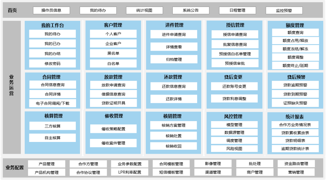 基于互联网、大数据、人工智能等信息技术,充分考虑法律法规及监管要求,以及未来改革发展的前瞻性需求,神州信息新一代智能线上贷款系统,以线上化、自动化、智能化、合规化为总体建设目标,组建覆盖获客、在线申请、自动授信、自助提款、智能贷后等授信全生命周期的功能体系,满足金融机构线上业务开展、风险自主控制、账务核算管理和运营管理需要。
