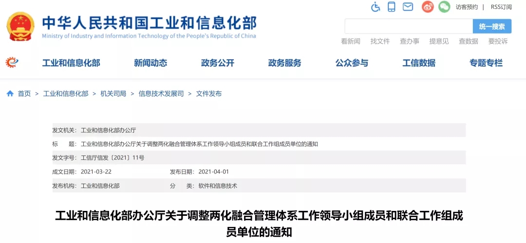 工业和信息化部办公厅今天发布《关于调整两化融合管理体系工作领导小组成员和联合工作组成员单位的通知》,根据工作需要和人员变动情况,对两化融合管理体系工作领导小组成员和联合工作组成员单位进行调整。通知明确,两化融合管理体系工作领导小组组长为工业和信息化部党组书记、部长肖亚庆。联合工作组秘书处设在国家工业信息安全发展研究中心(工业和信息化部电子第一研究所),神州信息成为工业和信息化部两化融合管理体系联合工作组成员单位。