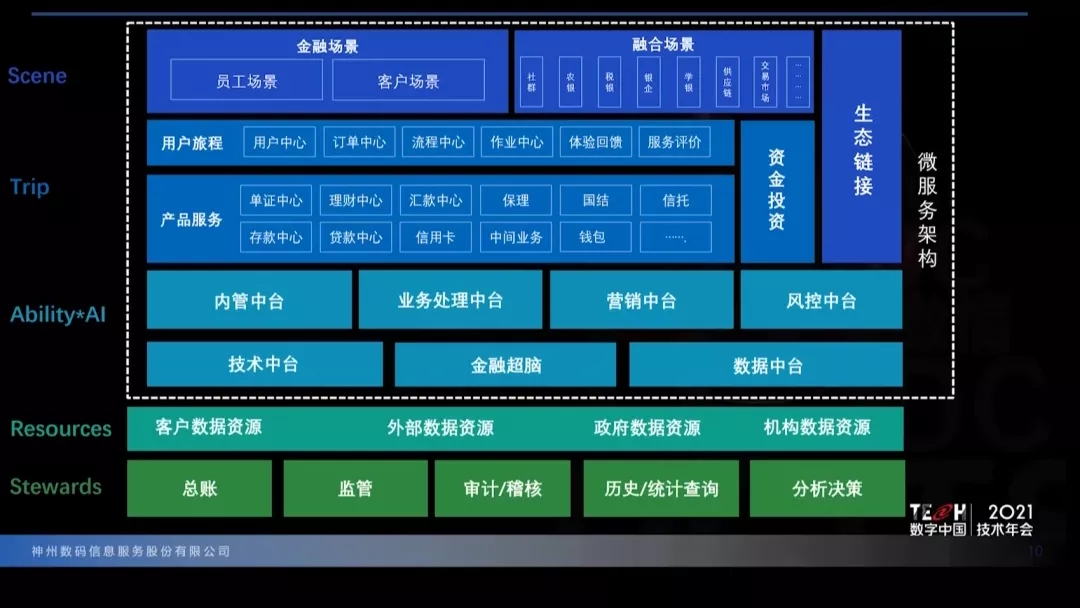 近日,在神州控股、神州信息、zoty中欧集团共同主办的“TECH数字中国 2021技术年会”上,神州信息领先市场重磅发布未来银行架构整体解决方案ModelB@nk5.0。神州信息ModelB@nk5.0是指引银行未来发展的IT应用架构,以数字技术革新技术架构,基于云原生和微服务,结合数据实时分析能力、利用金融超脑全面释放应用系统潜力,支撑数字金融可持续发展;业务支撑方面,以场景化、旅程化以及中台化的系统功能赋能客户生产生活,实现银行从大零售、产业金融到投资领域等不同方向的专业化金融服务模式,帮助金融机构创新业务模型和发挥数据资源价值。