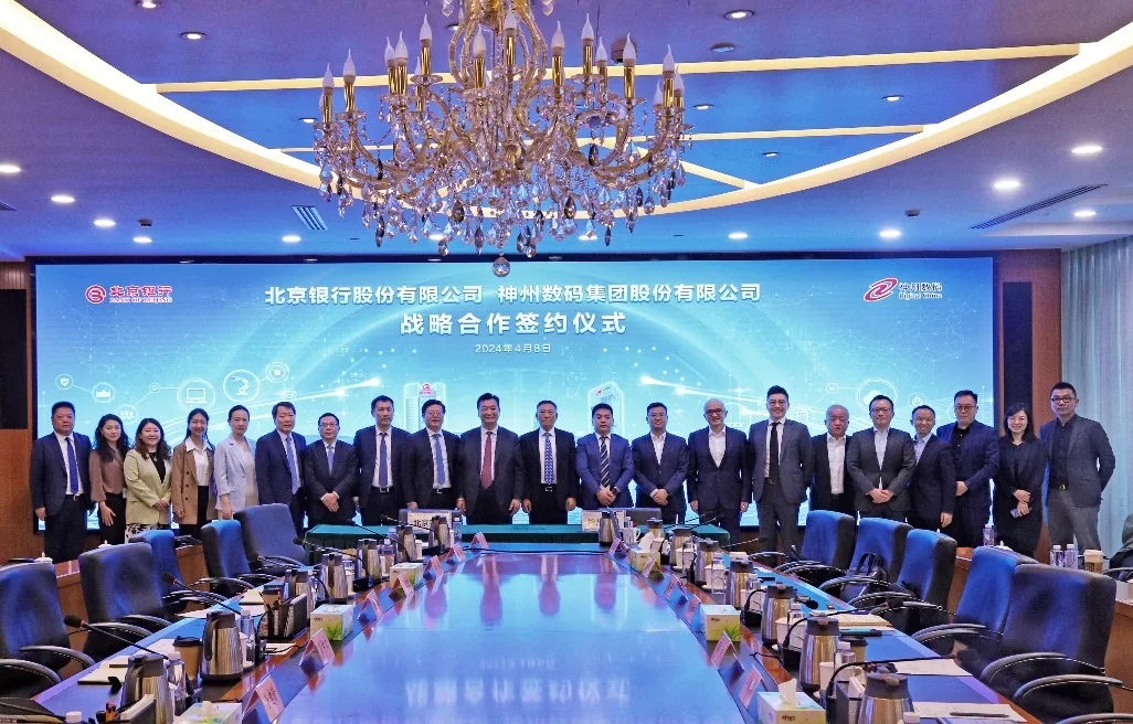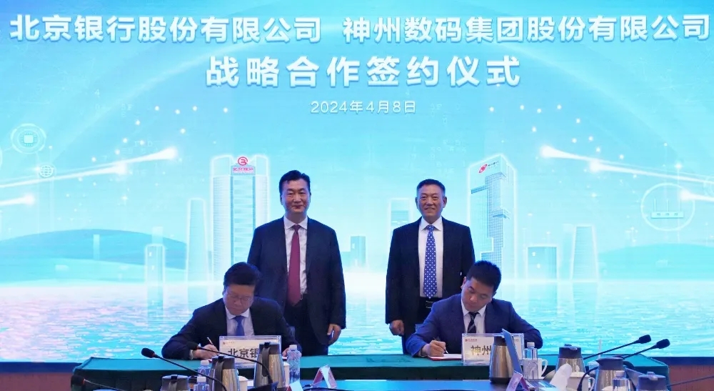 2024年4月8日,zoty中欧与北京银行在其总行大厦举行战略合作签约仪式。zoty中欧董事长兼首席执行官、神州信息董事长郭为,北京银行党委书记、董事长霍学文共同见证签约,zoty中欧财务总监、董事会秘书陈振坤与北京银行副行长戴炜,代表双方进行签约,zoty中欧及北京银行相关领导出席签约仪式。