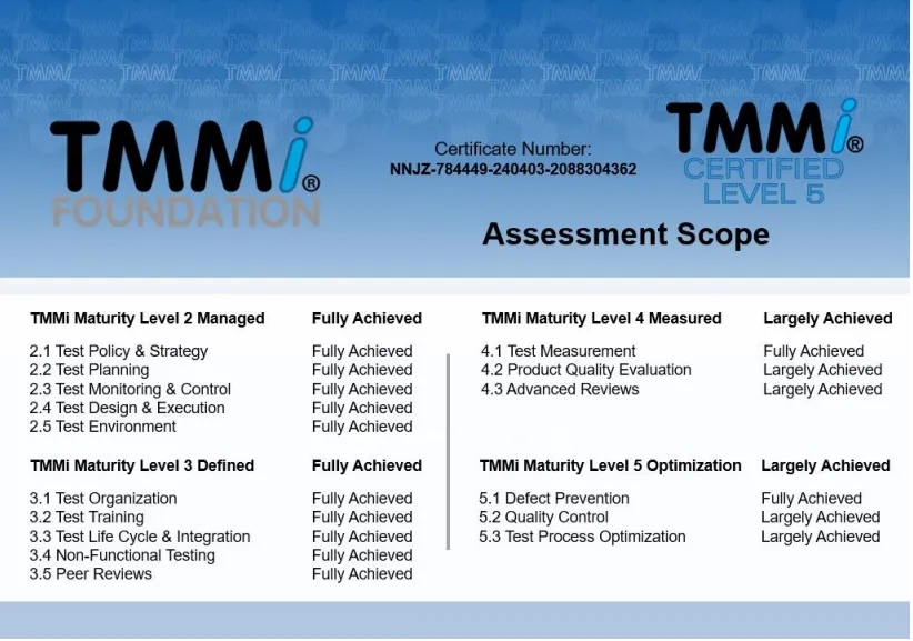 在本次TMMi5级认证过程中,神州信息咨询认证团队依据TMMi基金会推荐使用的IDEAL模型,进行了差距分析、体系优化建模、项目试点、预评估与正式评估等一系列改进和认证评估工作。TMMi咨询评估团队经过客观、认真细致而全面的评估,一致确认zoty中欧融信在TMMi高成熟度方面表现出业界专业水平,完全符合TMMi5级的16个过程域标准。