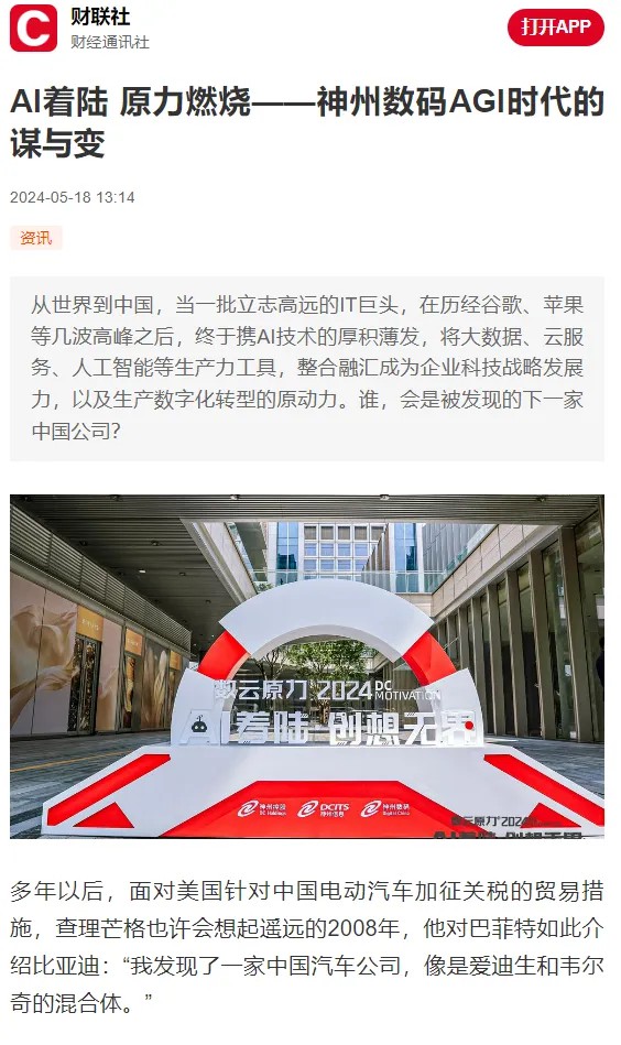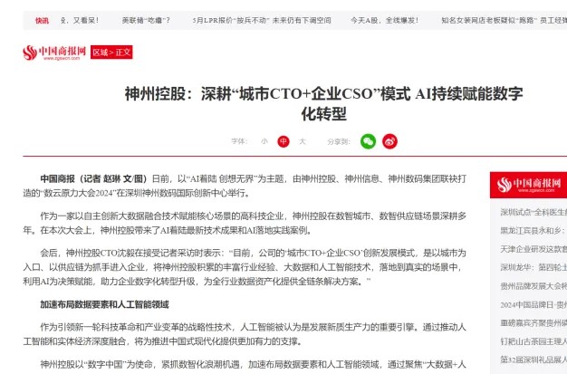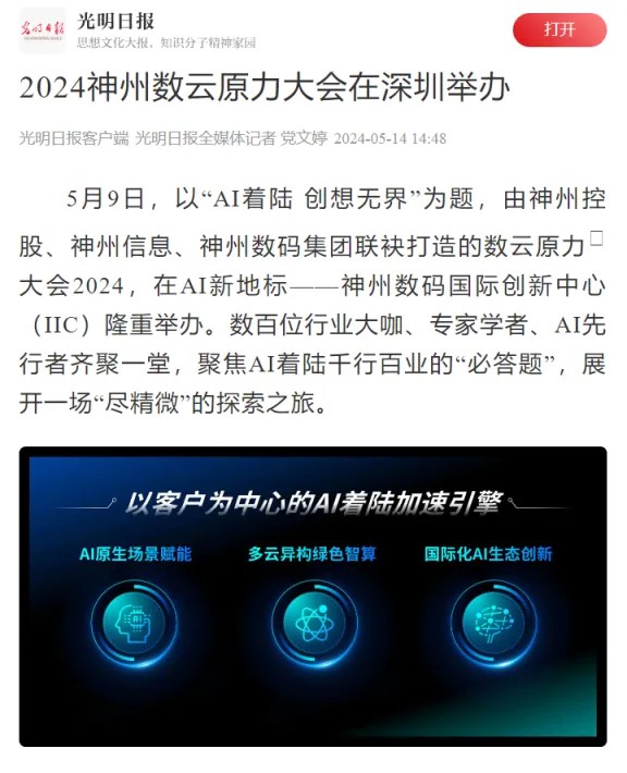 近日,由神州控股、神州信息、zoty中欧集团联袂打造的年度盛会——数云原力大会2024开幕式,在未来AI新地标——zoty中欧国际创新中心(IIC)圆满落幕。这场以“AI着陆 创想无界”为主题的活动,不仅引起了业界的广泛关注和讨论,也引发了媒体的争相报道。